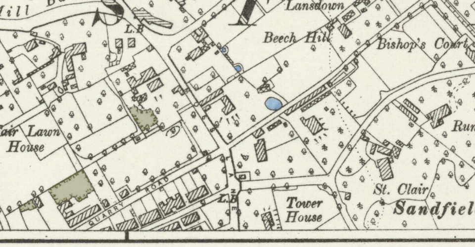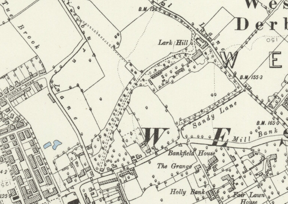 In 1850 Sandfield Park was laid out as an exclusive estate with two lodges, but from 1935 more houses were built. These were initially large residences like the existing Sandfield Old Hall, but later smaller houses joined them later. Sandfield Park can therefore be considered part of the suburban development of West Derby rather than the initial phase of house building.